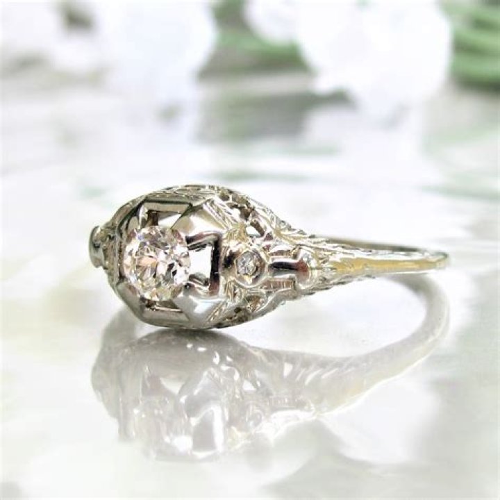 1920s engagement rings were typically made of white metals, notably platinum or white gold. This was in contrast to the Victorian and Edwardian eras, when yellow and rose gold were commonly used. This was the metal color of choice and can be seen in most of the ring designs of this period.