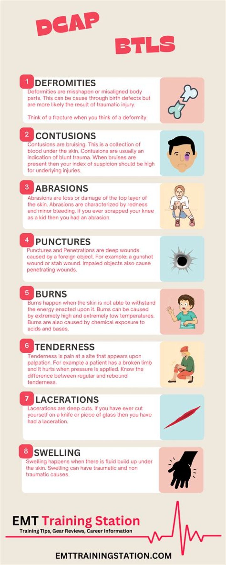 DCAP-BTLS: deformities, contusions, abrasions, punctures/penetrations, burns, tenderness, lacerations and swelling. Do you like using medical abbreviations to recall information during on-scene patient care and assessment?