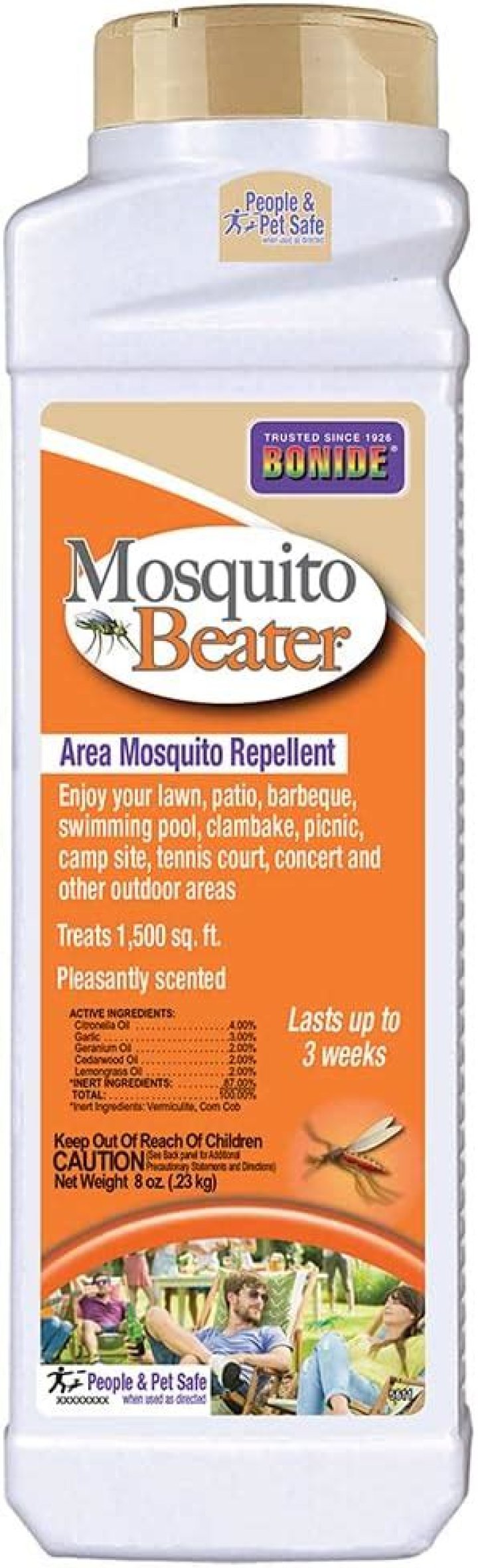 Bonide Mosquito Beater contains cedar oil, citronella oil, geranium oil, lemongrass oil and garlic to repel these annoying/ biting insect pests. Application should be made at least one hour before the area is to be occupied — provides effective, long lasting relief. May be used in areas where children and pets play.