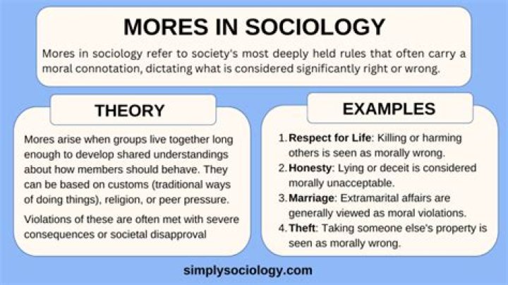 Mores are more strict than folkways, as they determine what is considered moral and ethical behavior; they structure the difference between right and wrong. People feel strongly about mores, and violating them typically results in disapproval or ostracizing.What are morals and mores?