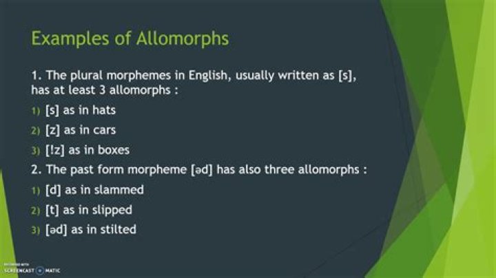 In linguistics, an allomorph is a variant phonetic form of a morpheme, or, a unit of meaning that varies in sound and spelling without changing the meaning. … The different allomorphs that a morpheme can become are governed by morphophonemic rules.