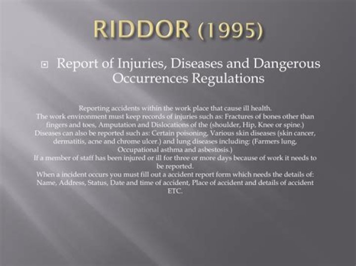 RIDDOR is the Reporting of Injuries, Diseases and Dangerous Occurrences Regulations 1995. By law it is required for employers, as well as people who are self-employed and people who are in control of a premises, to report specified incidents in the workplace.