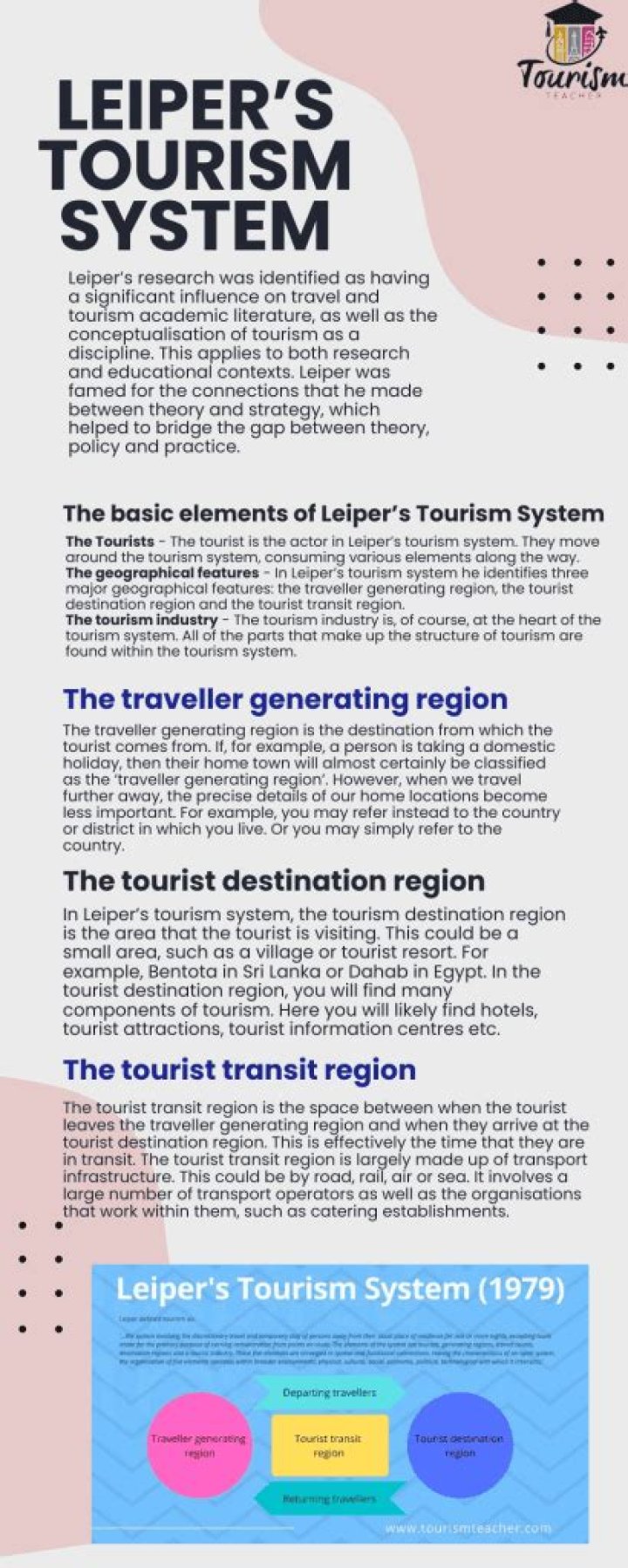 Leiper (1979) developed the whole tourism systems based on the systems theory and identified five basic components: tourists, generating regions, transit routes, destination regions, and a tourist industry operating within physical, cultural, social, economic, political, and technological environments.