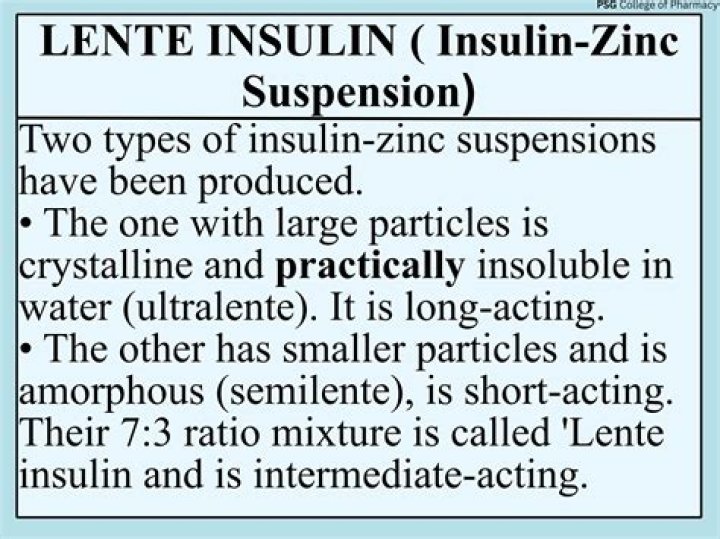 Lente insulin is a suspension of insulin in buffered water that is modified by the addition of zinc chloride. This insulin zinc suspension is equivalent to a mixture of 30% prompt insulin zinc (Semilente) and 70% extended insulin zinc (Ultralente).