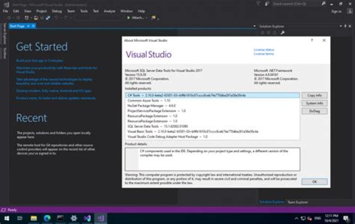 In Visual Studio, the Tab ‘Help’-> ‘About Microsoft Visual Studio‘ should give you the desired infos.