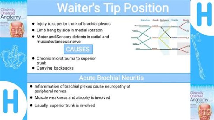 Waiters tip hand is a name used to describe the common deformity resulting from Erb’s palsy where the arm hands limp with internal rotation at the elbow and wrist causing to appear as if its being held out for a tip.