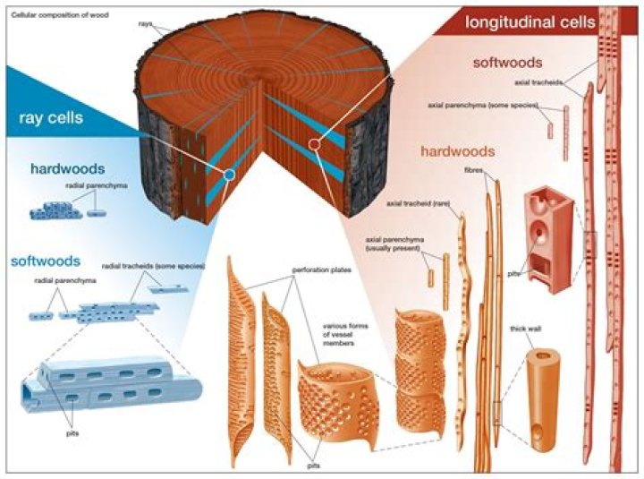In hardwoods the elongated cells are relatively short. Diameters are usually 0.1mm and lengths are usually 1mm. There are longitudinal pores that carry water through the tree. In softwoods the cells, also referred to as tracheids, are longer than in hardwoods.