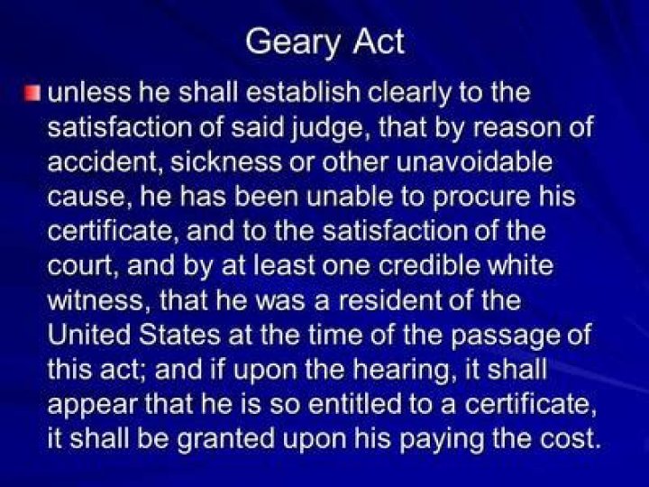 The Geary Act required Chinese people in the United States to carry a Certificate of Residence, a precursor of the green card system, to prove that they had legally entered the country. Chinese residents who were already living in the United States were required to register in order to receive their certificates.