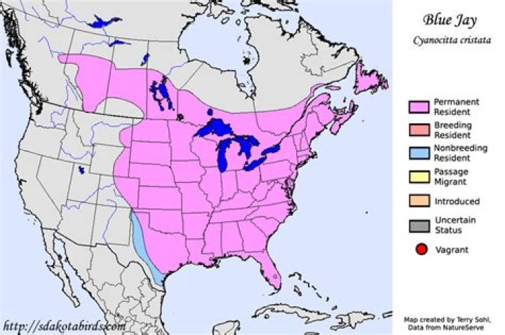 Distribution and habitat The blue jay occurs from southern Canada (including the southern areas of provinces from Alberta eastward to Quebec and throughout the Atlantic provinces) and throughout the eastern and central United States south to Florida and northeastern Texas.