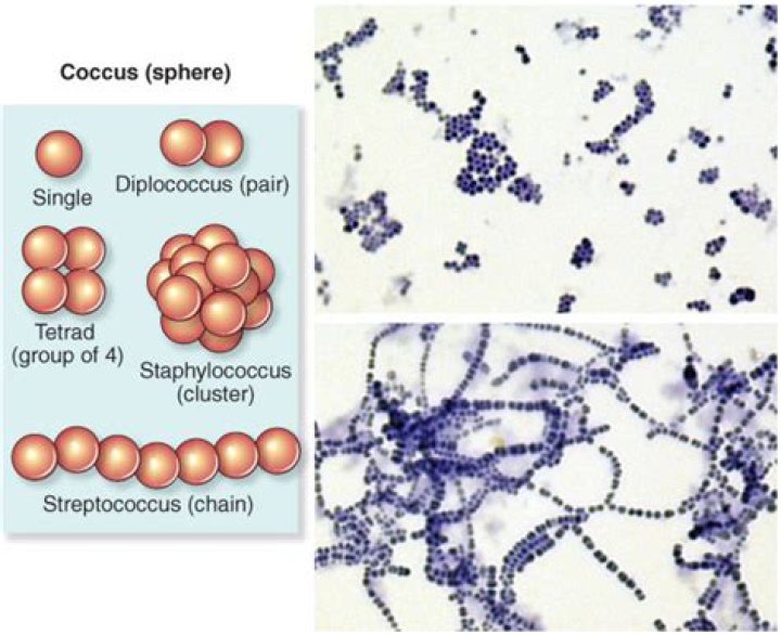 coccus arrangement Pairs of cocci are called diplococci; rows or chains of such cells are called streptococci; grapelike clusters of cells, staphylococci; packets of eight or more cells, sarcinae; and groups of four cells in a square arrangement, tetrads.Is Strep A Diplococci?
