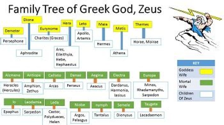 This gallery will showcase the Gods and Goddesses of Greek Mythology. It all starts with Zeus. Zeus has four siblings which include Hera, Hades, Poseidon, and Hestia. Zeus also had six children which include Artemis, Apollo, Hermes, Athena, Ares, and Aphrodite.Who is Zeus's eldest child?