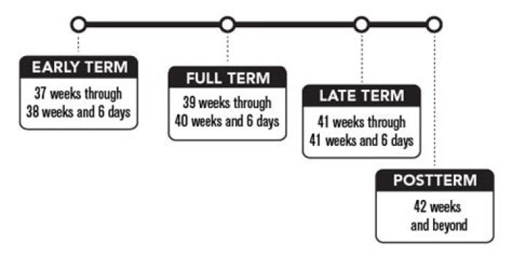 ACOG and SMFM use these definitions to describe term pregnancies: Early term: Your baby is born between 37 weeks, 0 days and 38 weeks, 6 days. Full term: Your baby is born between 39 weeks, 0 days and 40 weeks, 6 days.
