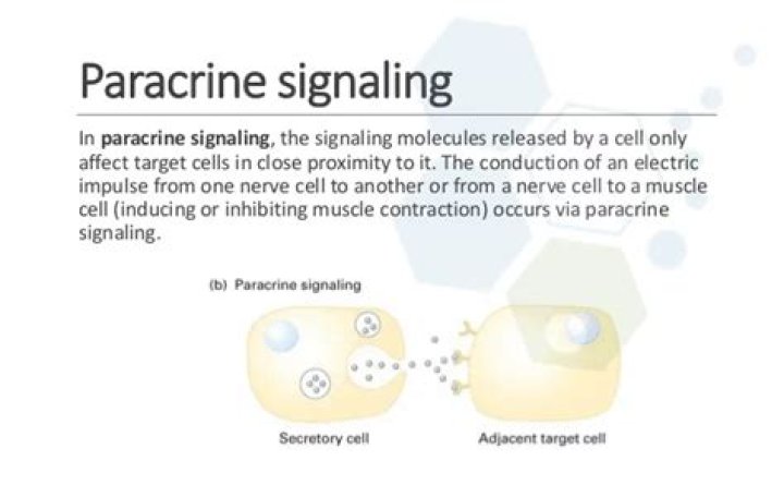 Terms in this set (39) * Paracrine signaling. A) involves secreting cells acting on nearby target cells by discharging a local regulator into the extracellular fluid.