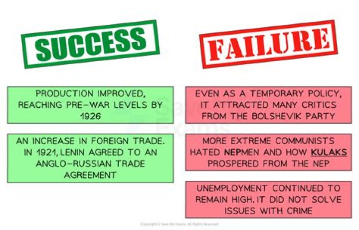 The NEP seemed a success. It returned the economy to pre-1914 levels and gave the Communist Party the breathing space it needed to survive: Production figures show the NEP was success. … Showed mixture of capitalist agriculture and state controlled industry could create economic growth.