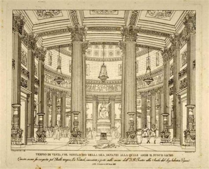 The small round Temple of Vesta was located at the east end of the Roman Forum. The site was a holy spot since the earliest times; the temple was rebuilt several times. Six Vestal Virgins were priestesses of the cult.