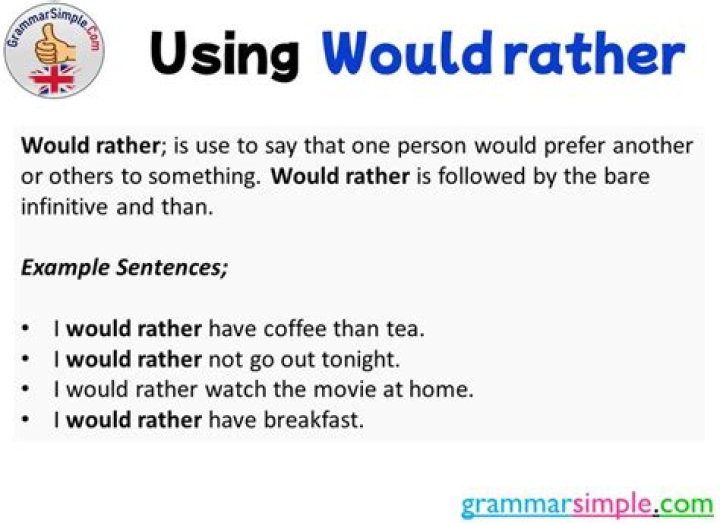 Its structure is: we start with the subject of the sentence followed by would rather and a verb in the bare infinitive form. For example: — “I would rather play the drums than the trumpet.” = I prefer playing the drums than the trumpet. — “She would rather eat pizza than soup.” = She prefers pizza than soup.